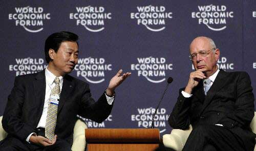 在大连举行的夏季达沃斯论坛上,夏德仁(左)与参会者讨论