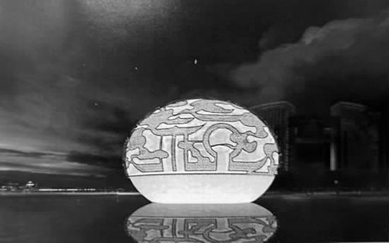 水滴状造型的城标雕塑,高约9米,内层用材转换成“透明”材质。外层为金属材料,构造如中国掐丝的传统艺术效果。
