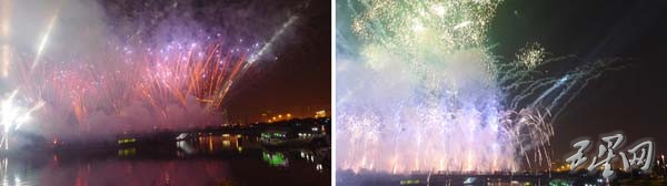 20时许,烟花大会正式拉开帷幕。数千枚烟花同时喷薄而出,一时间,黝黑的天幕,变成无垠的画面。烟花、激光完美结合,在天空、水面、地面形成立体的多维度的舞台,呈现出一派迷离梦幻又和谐的场景,优美的运河岸成为流光溢彩的华丽画卷。空中礼花争奇斗艳;岸边焰火升腾绽放,河面激光闪亮耀眼,立体瀑布飞流直下……缤纷焰火在空中交叉、重叠,令人惊艳的烟火秀,搭配专门编排的音乐表演,声色焰火,绚烂夜空。