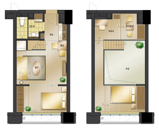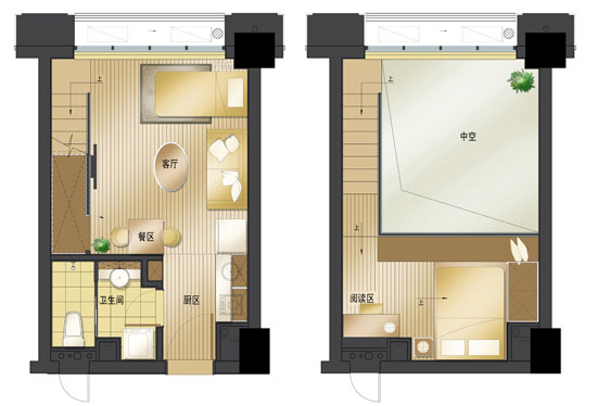 B户型主功能区域贯通的大开间宽敞、明亮,临窗可腾出单间休息区,也可布置或设计工作台,主区与书桌结合,生活与工作分隔于上下分区。