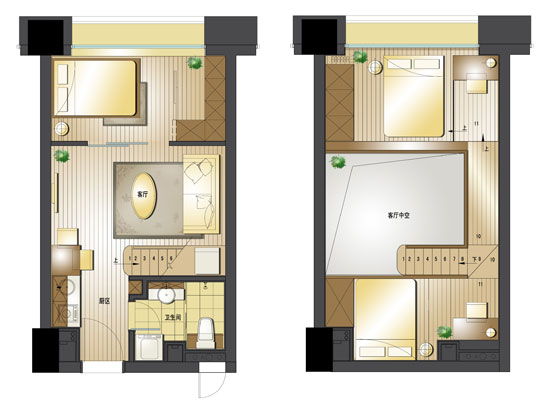C户型面宽4.2米,进深8米,黄金比例舒适三房设计。挑空客厅、上下三个功能区、带独立卫生间。面宽与进深比例协调,适用自用享受的单身贵族与甜蜜二人。