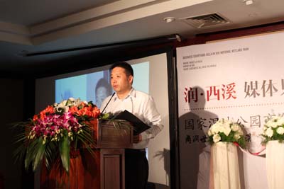 10月12日下午,世贸君澜大饭店三楼,乐声悠扬,人气鼎沸,国家湿地公园商务墅院——“润·西溪”项目媒体见面会暨展示中心启用仪式在这里隆重举行。本次活动由裘维维主持,到场嘉宾包括浙江嘉乐置业有限公司董事长卢培初先生、总经理李宏滨先生、常务副总经理卢永炜先生、副总经理卢鸣雷先生、副总经理陈靖华女士。另外还有特邀嘉宾:杭州房产协会副会长林作华先生、著名房产评论员丁建刚老师、德弘资产总裁王友军。