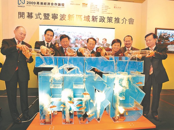 4日上午举行的二○○九甬港经济合作论坛开幕式上,甬港两地领导、嘉宾分别将甬江与香江之水一起注入由“甬港”两字组成的字模里,祝愿两地经济今后进一步融合,共谋美好发展前景。(严龙 摄)