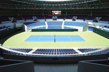 宁波网球中心位于高教园区鄞州体育馆西侧,北依文华路及宁波第九中学,南临日丽中路、沿河绿地及居住区,西面是学士路。整个中心占地120余亩,投资1.8亿元,由网球中心和游泳中心两大板块组成。网球中心包括可容纳4000名观众的中心赛场、拥有6片室内网球场的网球馆和16片室外网球场。整个场馆设计紧凑,内部布局科学,配套设施齐全又不显拥挤。在整体环境色彩的应用上,以优雅淡然的自然色为主。“网球比赛对运动员注意力要求很高,因此赛场环境设计得越宁静,越有助于运动员集中注意力,发挥出好的竞技水平。”项目承建方鄞州区城市建设投资发展有限公司副总经理胡军说。
