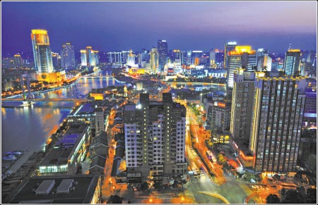 夜幕降临,华灯绽放,宁波三江口犹如一幅隽永绵长的美丽画卷:所有的堤岸,被一串串“眨着眼睛”的红色、蓝色景观灯包围着;霓虹灯点缀着灵桥,似彩虹倒映在平静的江面上;波平如镜的江面倒映着五光十色的高楼大厦,美轮美奂,令人目不暇接。图为笔者近日登高拍摄的宁波三江六岸夜景。