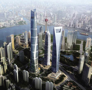 2014年,上海中心大厦建成后将于金茂大厦、环球金融中心呈三足鼎立态势。