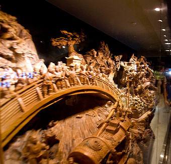 7月16日,上海世博会河南馆,大型根雕《清明上河图》吸引大批游客关注。根雕高2.56米、宽2.1米、长18米,重达12吨,是目前世界上最大的根雕。这件根雕的原料是从东南亚进口的一整棵香樟古木,树高百米,树干直径4米,根径20米,有2300年树龄,完全暴露风干近10年。由35位艺术家和工匠用了5年时间制作而成,并根据木头的纹理分段切割,最后经由集装箱运抵上海。