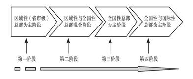 从发展阶段来看,广州总部经济处于发展的第二阶段。总部经济的发展经历以下几个阶段:(1)区域性(省市级)总部为主的阶段;(2)区域性总部与全国性总部混合阶段;(3)全国性总部为主的阶段;(4)全国性与国际性总部为主阶段。广州的政治地位不如首都北京,经济地位不如上海,在发展总部经济上的绝对优势并不明显。广州市总部经济以区域性总部为主,其次是跨国公司地区总部,国家级的总部企业最少,是区域性总部主导下的各类总部企业相互交叉、并存发展的阶段,处于总部经济发展的第二阶段,应积极培养全国性总部企业,向第三阶段即全国性总部为主发展(见图1)。