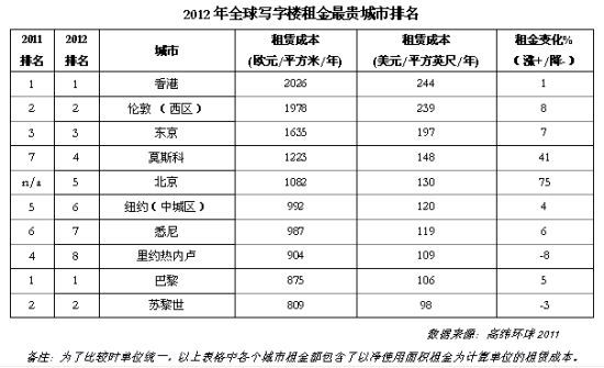 在全球范围内,香港连续两年蝉联全球写字楼租金最贵城市排行榜首位,紧随其后的是伦敦(西区)和东京。前三名的城市跟2010年相比没有变化,但2010年,最贵城市是东京,其次是伦敦,香港位于第三。