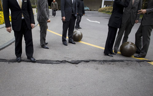 2012年2月16日,上海陆家嘴环球金融中心前,一记者拍摄到附近地面裂痕。当日微薄报料称,环球金融中心与在建的上海中心间地面发生裂缝,地形上下错开。据在现场测量的上海建工工作人员介绍,这几道裂痕出现已经有段时间了。