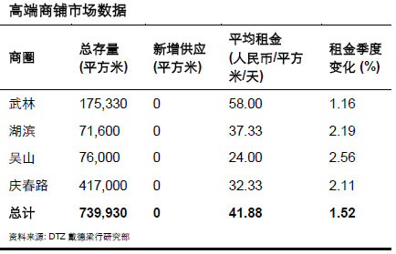 2011第三季度杭州没有高端新增供应面世。但在新兴的钱江新城中央商务区的影响下,庆春路商圈在所有被选区域中,仍然拥有最多高端零售空间。随着嘉里中心和来福士广场等重量级项目在未来两到三年内来问世,这将再次提高庆春路商圈的商铺存量和整体租金。
