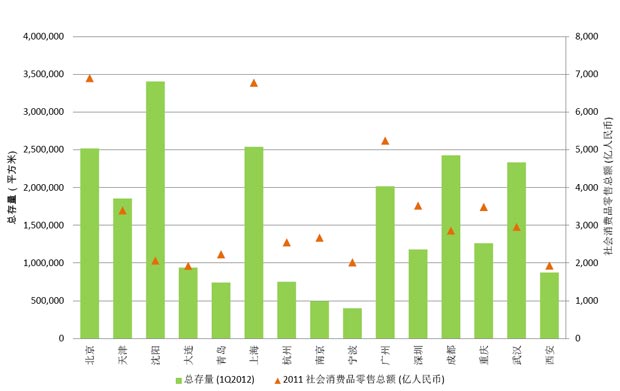 2012年全国零售物业存量与2011年社会消费品零售总额对比图