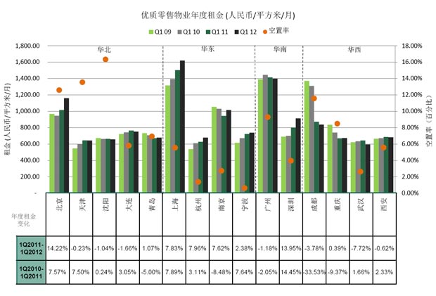 文章导读: 世邦魏理仕北京分公司最新发布的2012年第一季度写字楼市场状况,显示北京写字楼租赁市场表现活跃,需求总量高位运行,租金继续上涨,空置率下降;而北京零售物业市场新增供应增加,整体空置率微升;北京高档住宅租赁市场