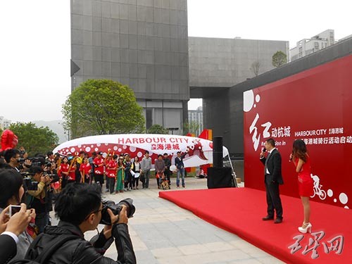 1点50分,在响亮的鸣枪声中,无数的红色气球飞向空中,20米长的红色飞艇升空而起,3队等候在各个骑行区域的骑行队员也开始启动,20人一组的骑行队组成红色的河流穿梭于杭城中,在春日下为市民带去红色的气球,让您在这烂漫春日感受来自西溪海港城的红色热情。