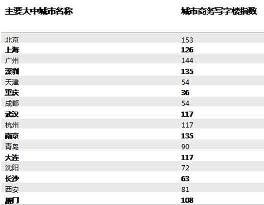 全国16个大中城市2014年第4季度的商务写字楼指数,如下表所示:
