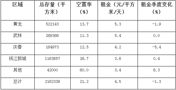 新增供应的甲级写字楼将全市的总体空置率拉高了1.1%,达到21.2%。就地区差别而言,武林保持了全市最低的空置率,为11.3%。进入2015年第二季度,随着更多新项目入市,戴德梁行估计,杭州写字楼市场总体空置率会继续上升2%-4%。