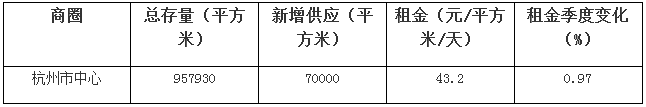 一季度,湖滨银泰三期、四期相继开业,刺激了杭州商铺市场的平均租金及出租率的上升,据统计,杭州平均租金环比上升0.97%到43.17元/平方米/天,出租率上涨 0.38%到97.62%。