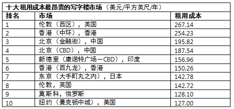 世邦魏理仕追踪调查了全球127个市场优质写字楼的租用成本。调查发现,全球50个最昂贵的市场中,亚太区占了其中的20个,居全球各地区之首。