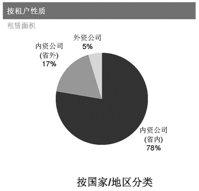 按租户行业来看,IT业租赁面积占比达到六成以上,金融服务业占到逾两成,其余则为专业服务业、房地产行业、制造业等,占比均在一成以下。按租户性质来看,浙江省内的内资公司占据了大半壁江山,占比高达将近八成,省外的内资公司占到近两成,外资公司的市场份额继续萎缩,占比仅为5%。
