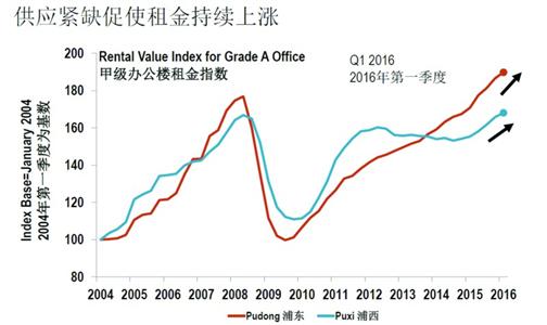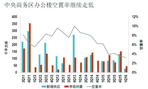 在现代服务业持续发展的支撑下,上海办公楼需求强劲。来自仲量联行的最新统计显示,2015年,上海办公楼租赁市场净吸纳量创历史新高,达到约145万平方米,几乎是2014年的两倍。2016年一季度,虽然中央商务区新增写字楼供应较有限,但即将竣工项目的强势预租表明,目前市场需求依然强劲。