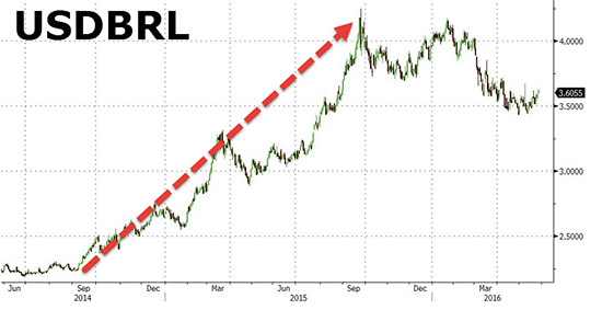 美元持续升值,创下了16个月来最佳月度表现。下图显示,过去两年,美元对巴西雷亚尔大幅升值: