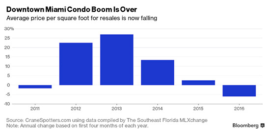 CraneSpotters.com数据显示,今年1月-4月,迈阿密公寓的成交量较去年同期下滑了25%,而同时,每平方英尺均价下跌了6%。