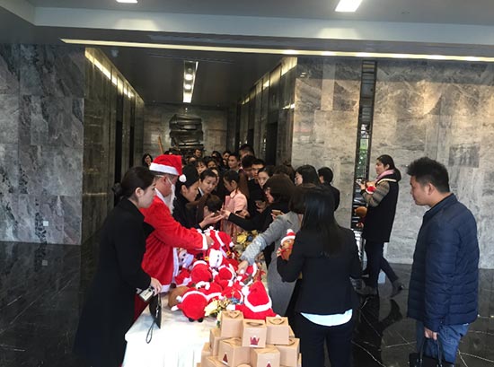12月23日的武林时代一楼大厅,不同于往昔,“暖心圣诞,时代献臻礼”活动在这里温馨上演。武林时代为入驻企业员工特别奉送了圣诞小礼——萌萌的圣诞老人公仔、可爱的麋鹿玩偶、可口的平安果……将沉甸甸的爱心打包,而传递在礼物间的爱和幸福,环绕着整座写字楼。一波又一波员工陆续被吸引过来,他们规整有序地排好队参与活动,在领到了自己的礼物后,那溢于言表的笑容,就是这份惊喜与幸福的最好证明。