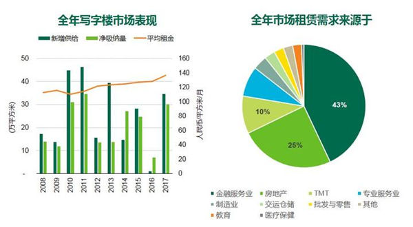 全年4个优质甲级写字楼入市,为市场带来34.6万平方米新增供应,年底写字楼空置率为17%,与2016年持平。全年净吸纳量为五年新高,累计达30万平方米。年底平均租金同比增长3.7%,达每月每平方米136.7元,创历史新高。