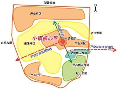 小镇空间布局将围绕“一心两轴四区”的格局展开。