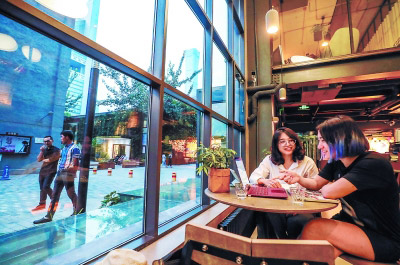 郎园内由旧厂房改造的办公空间里,几位白领在讨论工作