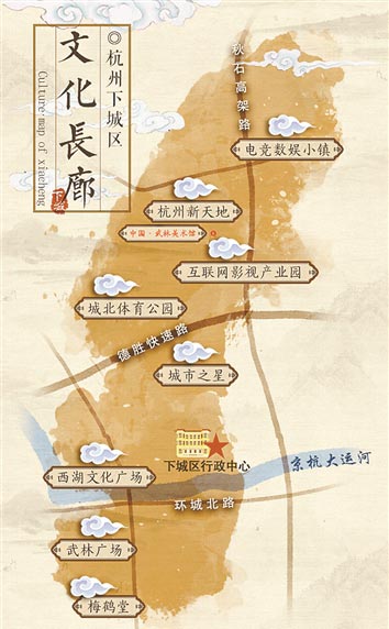 今年,下城区首次推出了“下城文化地图”。地图上显示出下城一条清晰可见的“文化长廊”——梅鹤堂+武林广场+西湖文化广场+城市之星+城北体育公园+互联网影视产业园+新天地+电竞数娱小镇,其文创产业也是依托文化长廊来精准布局的。