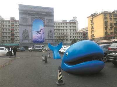 福地创业园停车场上的蓝鲸模型和“凯旋门”很吸睛