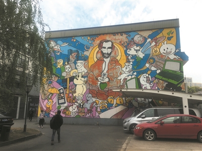“中央楼王”的右侧,也是一栋四层小楼。面向停车场的墙上,有一幅风格奇特的画,一堆小黄人、暴走漫画、超级玛丽之类的卡通人物和数码产品,环绕着戴耳机的乔布斯。赛博朋克,大概就是这种风格。