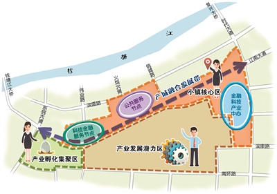 北至滨盛路,东至时代大道,西至东信大道,南至南环路,就在这块4.4平方公里的土地上,金融科技小镇将形成“一心一带两点三区”的发展格局。