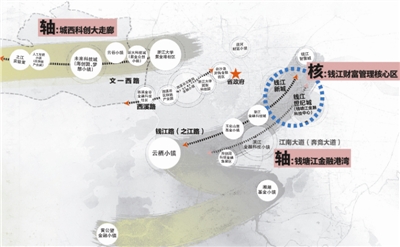“两轴”,指杭州城区范围内的钱塘江金融港湾和城西科创大走廊的规划空间。