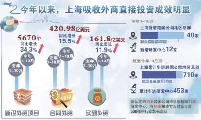 “蒂姆·霍顿”是跨国企业在上海加速发展的一道缩影。来自市商务委的统计数据显示,今年1-10月,本市共新设外资项目5670个,同比增长34.3%,合同外资420.98亿美元,同比增长15.5%,实到外资161.8亿美元,同比增长11.9%。与此同时,跨国公司地区总部也加快落户,今年1月至10月,上海新增跨国公司地区总部40家(其中亚太区总部26家)、研发中心12家。