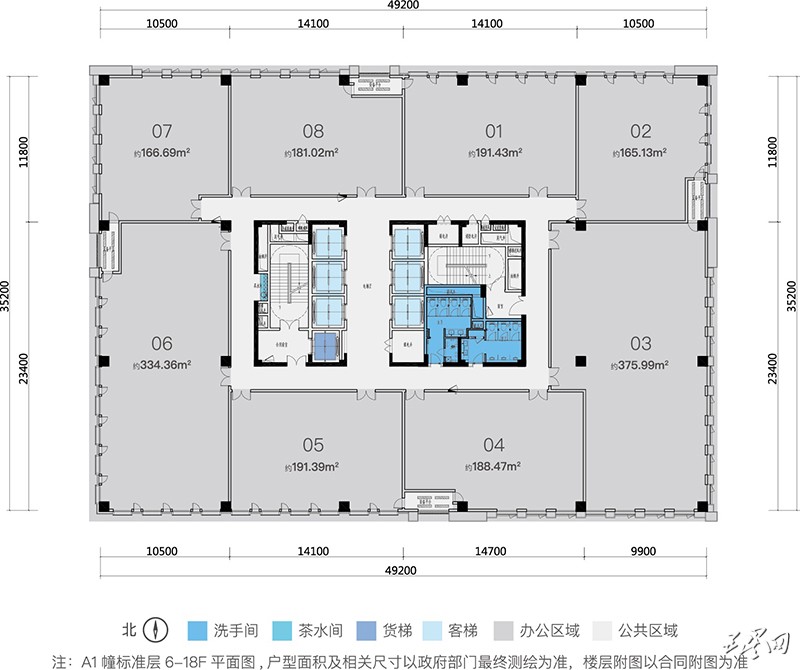 注:以上内容均为运河万科中心A1/A2幢租赁办公产品,A3幢销售办公大堂面积约500㎡,室内为毛坯,标准层层高约4.76m,实际以交付及合同约定为准。