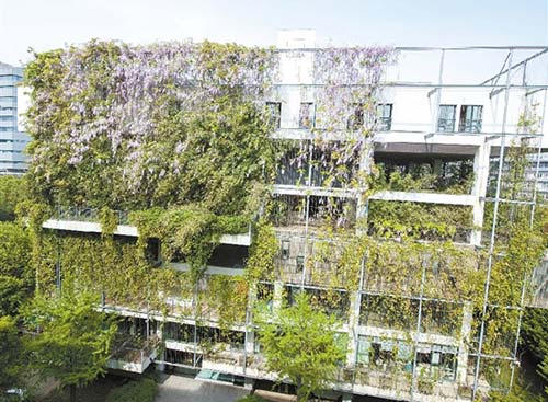 另外,整幢楼的植物选择也有讲究。比如现在是春天,整幢大楼围绕着紫藤花,到了秋天则是红色、黄色植物的天下了。