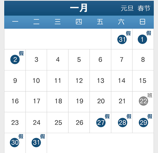 二、春节:1月27日至2月2日放假调休,共7天。1月22日(星期日)、2月4日(星期六)上班。