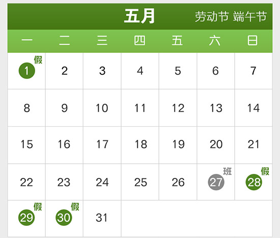 五、端午节:5月28日至30日放假调休,共3天。5月27日(星期六)上班。