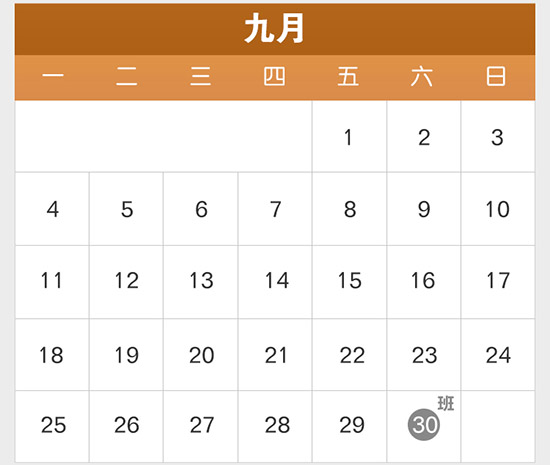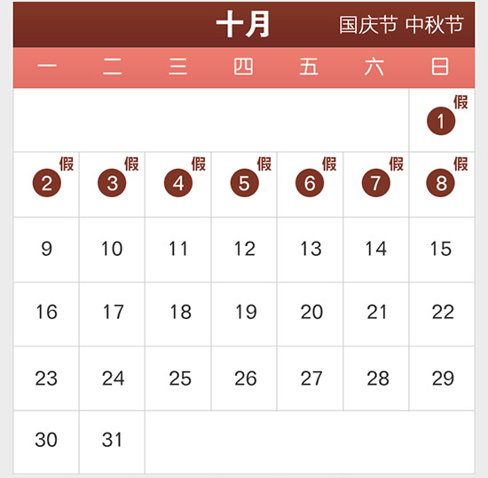 六、中秋节、国庆节:10月1日至8日放假调休,共8天。9月30日(星期六)上班。