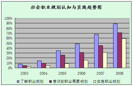 在向阳生涯调查的12000多个样本中,2003年了解职业规划的人有8%,意识到职业需要规划的人为5%,实施职业规划的只有3%。到了2007年,了解职业规划的人已经超过50%,意识到职业需要规划的人数是2003年的数倍,实施职业规划的人数则大幅跃升。可以看出,自2000年前后中国开始引入职业规划的思想与方法以来,职业规划快速得以在国内传播与发展,人们的职业规划意识在觉醒。通常,一个人从了解职业规划到意识到职业需要规划,再到真正开始做职业生涯规划需要一个过程,短几个月,长则几年。许多人也曾考虑过是不是要做一下专业的职业规划,但由于种种原因始终没采取行动,容易导致自己的职场处境越来越被动。