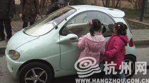 记者朱燕:在浙大玉泉校区的电机工程楼的北侧,找到了读者说的那辆粉绿色的小车,车标为“EV”(电动汽车的英文Eleotdc Vehicle缩写)。旁边停着一辆黑色帕萨特,EV车只有它的1/3大小,长得非常Q(网络上形容很可爱)。