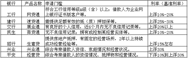 交行的“展业通”在基准利率上上浮20%以上,属于中等偏上水平。兴业银行的“兴业通”在基准利率上上浮30%,属于较高水平。建行的“速贷通”贷款利率则在基准利率上上浮30%,也属于较高水平,但如果小企业主同时申请了配套业务,包括网银、给员工办理贷记卡等,则可享受到上浮25%的贷款利率。