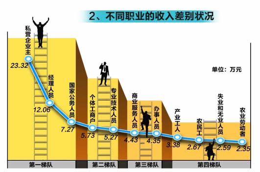 从职业类别来看,不同行业收入差距也很大。收入可以排成四个梯队(见表2),排在第一梯队的分别是私营企业主(23.32万)、经理人员(12.06万)和国家公务人员(7.27万);排在第二梯队的分别是个体工商户(5.73万)、专业技术人员(5.27万);排在第三梯队的分别是商业服务人员(4.43万)、办事人员(4.35万);排在第四梯队的则是产业工人(3.38万)、农民工(2.67万)、失业无业人员(2.59万)和农业劳动者(2.35万)。