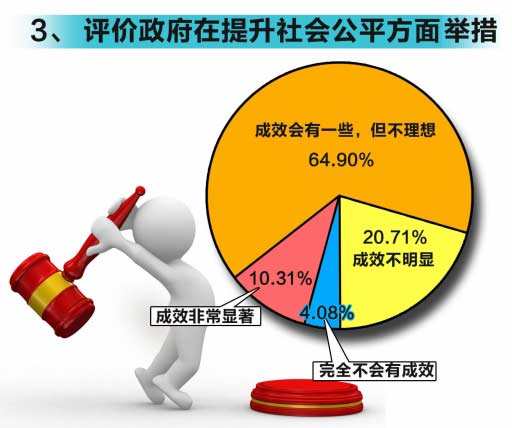 在问到“您认为政府现在提升社会公平方面的举措在未来数年内的成效如何时”,民众的信心不足,认为成效非常显著的仅占10.31%,而近九成的人认为成效不理想(64.9%)或不明显(20.71%),或完全不会有成效(4.08%)。(见表3)