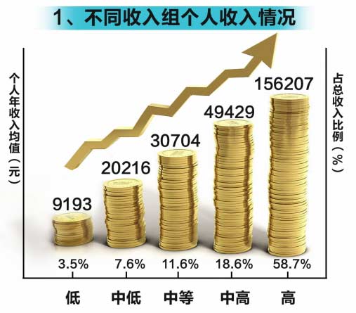 报告中的关键数字令人深思:20%高收入组的个人年收入均值是20%低收入组的17倍;20%低收入组占有的收入仅占总收入的3.5%,而20%高收入组占有的收入达到了总收入的58.7%,七成以上调查者收入在平均线以下,贫富两极分化的趋势渐明显。