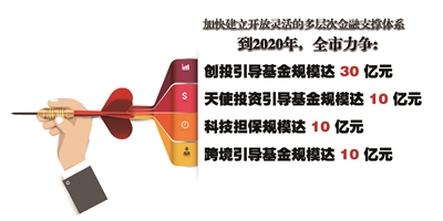 加快建立开放灵活的多层次金融支撑体系。到2020年,力争创投引导基金规模达30亿元、天使投资引导基金规模达10亿元、科技担保规模达到10个亿和跨境引导基金规模达10亿元;