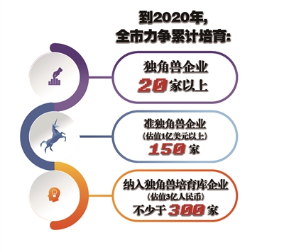 到2020年,全市力争累计培育独角兽企业20家以上,准独角兽企业(估值1亿美元以上)150家,纳入独角兽培育库企业(估值3亿元人民币)不少于300家,建立分类分层的独角兽企业培育扶持体系。