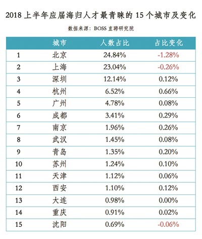 数据显示,2018年上半年,选择在北上广深求职的应届海归(毕业时间为2018年)比例较2017年同期下降1.3%,而选择二线城市的应届海归占比则上升1.2个百分点至28.3%。